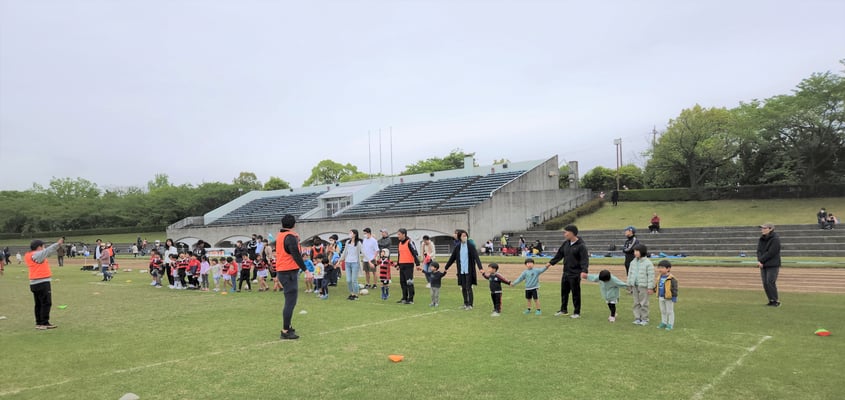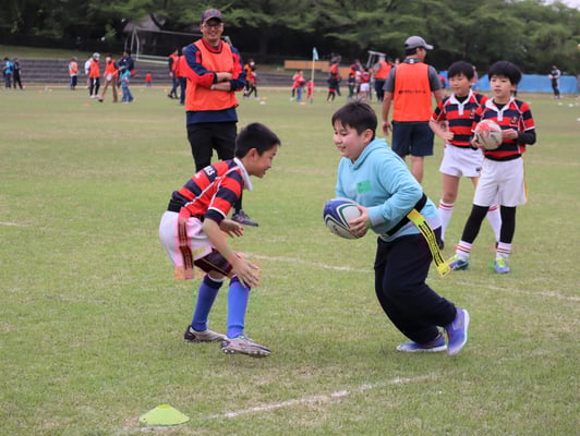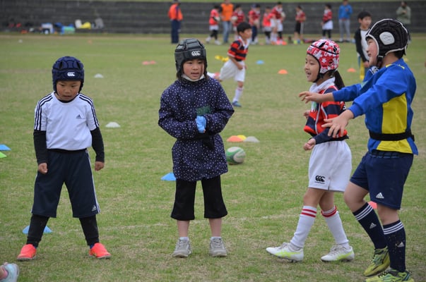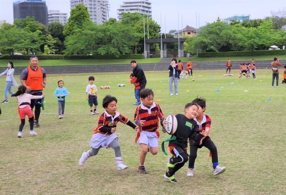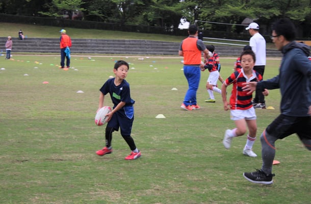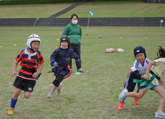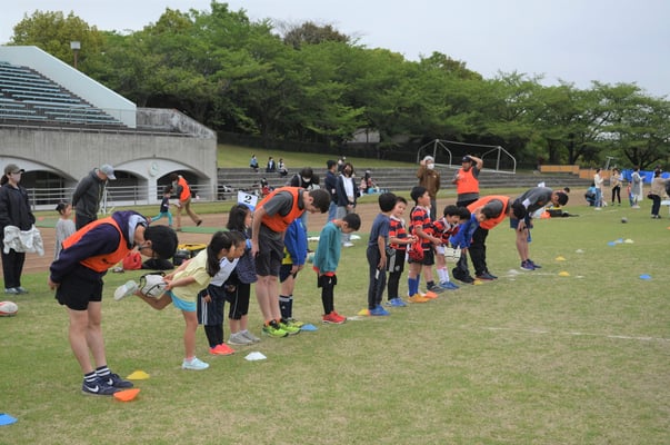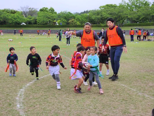 当日の参加者は期待通り35名もの参加があり、同時に行うラグビースクール生徒が数多くいるため、会場はたいへんな賑わいとなり、鬼ごっこ等の遊びメニューから、ラグビーボールを使ったメニューを通して、ラグビーの動きを体験して、最後には、タグラグビーゲームなど実際の試合も体験して、笑顔溢れる楽しい体験会を開催することができました。
