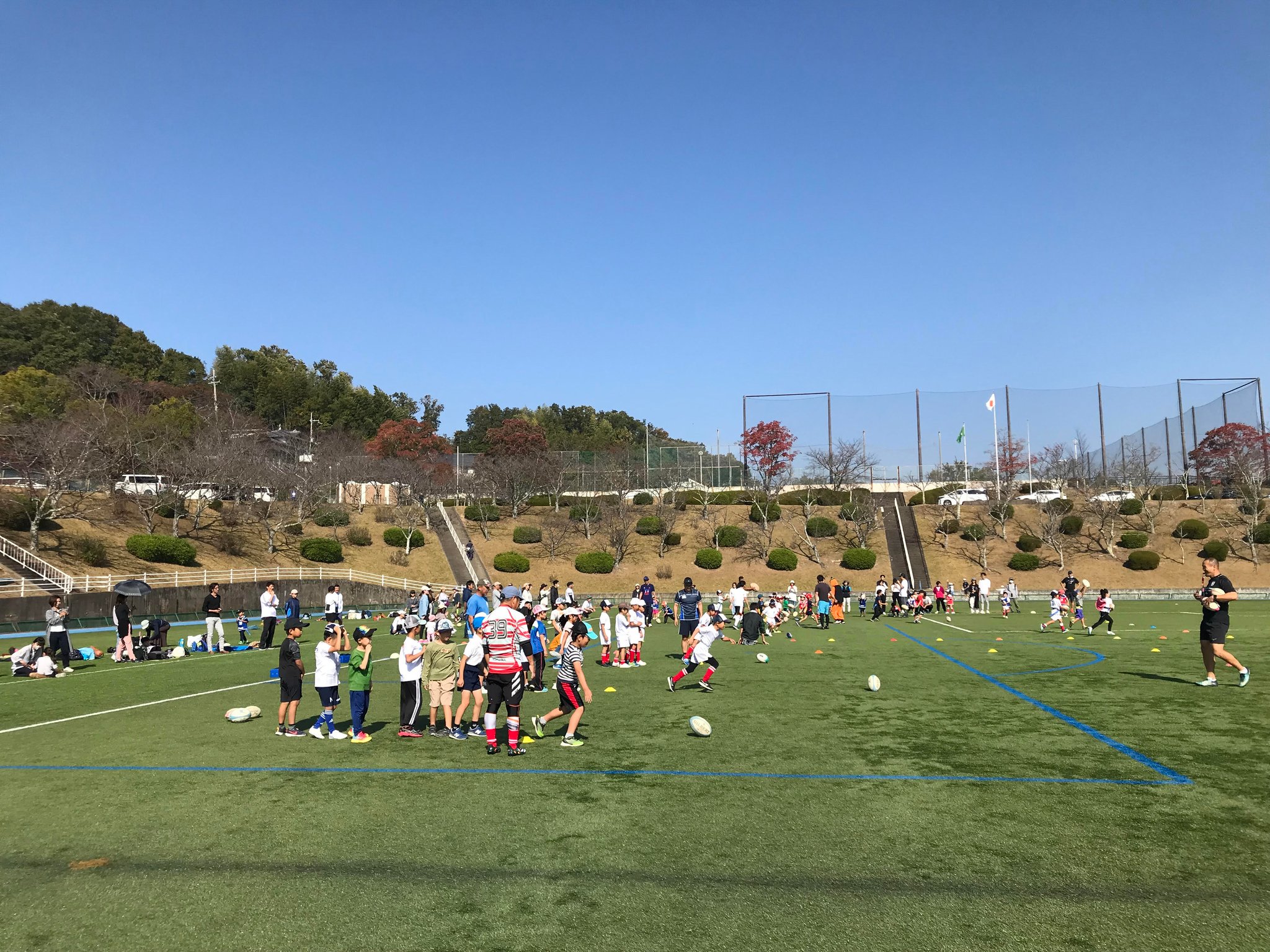 ジュニアラグビー体験会は、中学校部活動担当教員の過剰労働問題を背景に、クラブ活動の地域移行を進める政策の流れに沿って、まず、「新たな地域クラブ」としての生駒市中学ラグビー部を立上げ、将来的な地域による部活動の受け皿づくりを目指す生駒市と共同で取り組みを開始したもので、一般参加者とIJRC中学部と6年生、5年生、計40人で実施しました。終了後は、皆すがすがしい顔した気持ちの良い体験会になりました。』