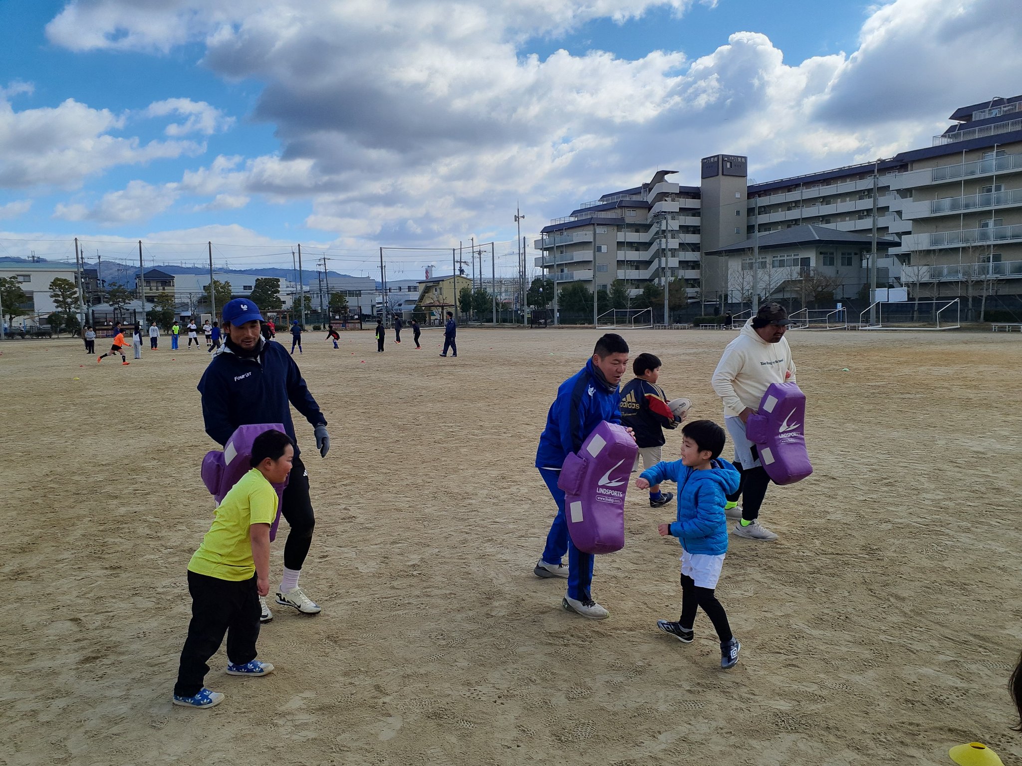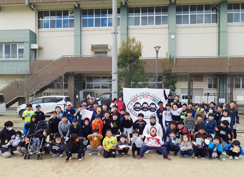 講師を八尾ラグビースクール出身で元日本代表の守屋 篤氏に依頼し、ウオーミングアップからゲーム感覚を交えて行った後、小グループに分けてリレー形式でいろいろなボールゲームで競争しました。簡単なタグ取り合いゲームの後、コンタクトバッグを使ってヒットすることの楽しさを体験、クールダウン後は、参加記念品としてスクラムジャパンのロゴ入り金平糖(八尾市特産)を配布、記念撮影をして終了しました。また、今年開催されるラグビーワールドカップ2025の日本代表候補で八尾ラグビースクールOGの西亜利沙さんが飛び入りで参加してくださったり、前回に続いて障がい者施設からの参加もあり、一緒になって楽しんでもらうことができました。