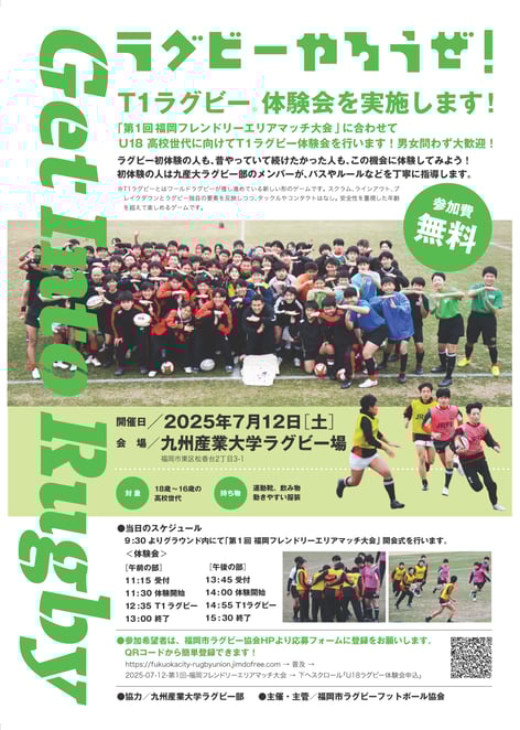 福岡市ラグビー協会は、福岡市近郊のU18高校チームの普及・育成を目的とし、U18世代のラグビー競技人口の減少対策として、体験会を開催しました。