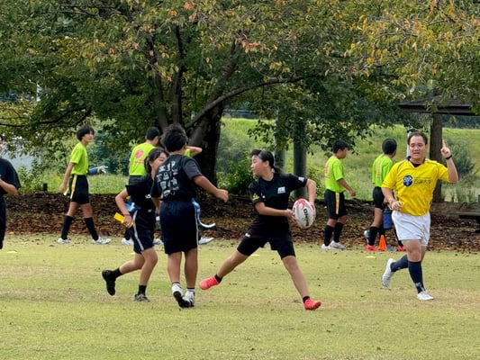 競技規格としてコートサイズは、縦40m×横30mと小学生大会より拡大し、心肺機能の高まりが期待できる中学生期の競技として、5分ハーフの予選リーグと7分ハーフの決勝トーナメント・リーグで実施しました。参加者は、ジュニアラグビーを継続している者、部活動等で他競技を行いながらも定期的にタグラグビー活動に参加している者、中学生から新たにタグラグビーを始めた者等、様々でしたが、「タグラグビー」という共通ワードのもと、秋晴れの真剣勝負を、チームメイトとともに全力で楽しんでいました。