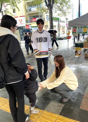 この日はラグビー日本代表の試合に合せて、ラグビーのまち府中市がけやき並木通りで行うラグビーイベントを開催しました。そこで、同市の賑わいを創出する(株)まちづくり府中様のご協力により、スクラムバナナのサンプリングがけやき並木通りの京王線府中駅前で行なわれました。