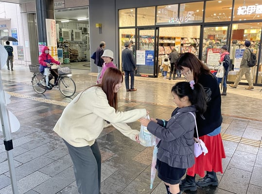 親子連れや、お買い物で街を行き交う市民の方々に、専用のチラシとともにバナナが配布されました。
