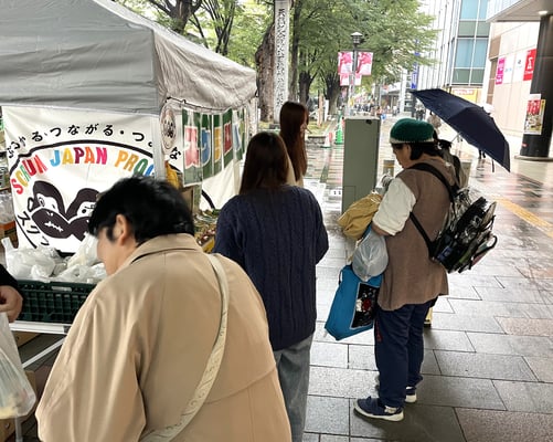 スクラムバナナ600パックを用意して、12時過ぎから配布をはじめました。雨天のためいつもより人通りは少なかったかもしれませんが、2時間半ほどで市民の方々にバナナをお渡しできました。