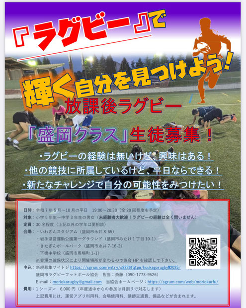 ・参加者は盛岡ラグビースクールに所属する生徒が多い現状ではありますが、中学校3年生が所属中学校部活動の引退をきっかけに放課後ラグビーを通じてプレーした生徒が数名いたことは、今後の明るいこととして捉えています。